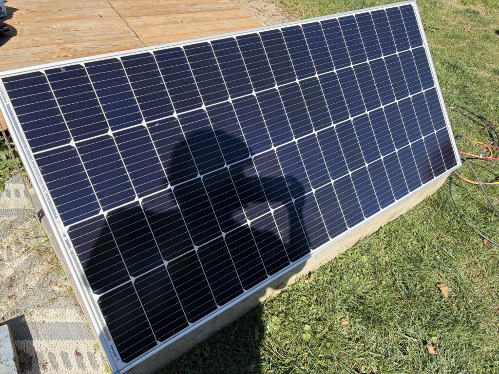 The trailer comes from the factory with 400 watts of roof-mounted solar panels but we wanted to go overboard to make sure we didn’t every have to worry about running the battery down. We bought an additional 200 watt solar panel from Renology (a major solar supplier) and put it next to the trailer in a rack I built with adjustable panel angle (to compensate for the changing height of the sun in the sky as the seasons change.Solar power systems need what’s called a charge controller to managing the energy available from the solar panels to the charging needs of the battery. The charge controller which was factory-installed with the roof-top solar panels was large enough to handle the extra power coming from the additional panel we bought. However, for technical reasons, panel efficiency is sacrificed if one controller is used to manage panels from two different manufacturers. In the interest of getting the most out of the panels, I installed another Victron charge controller which is strictly dedicated to the new panel we bought.