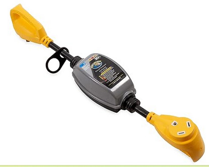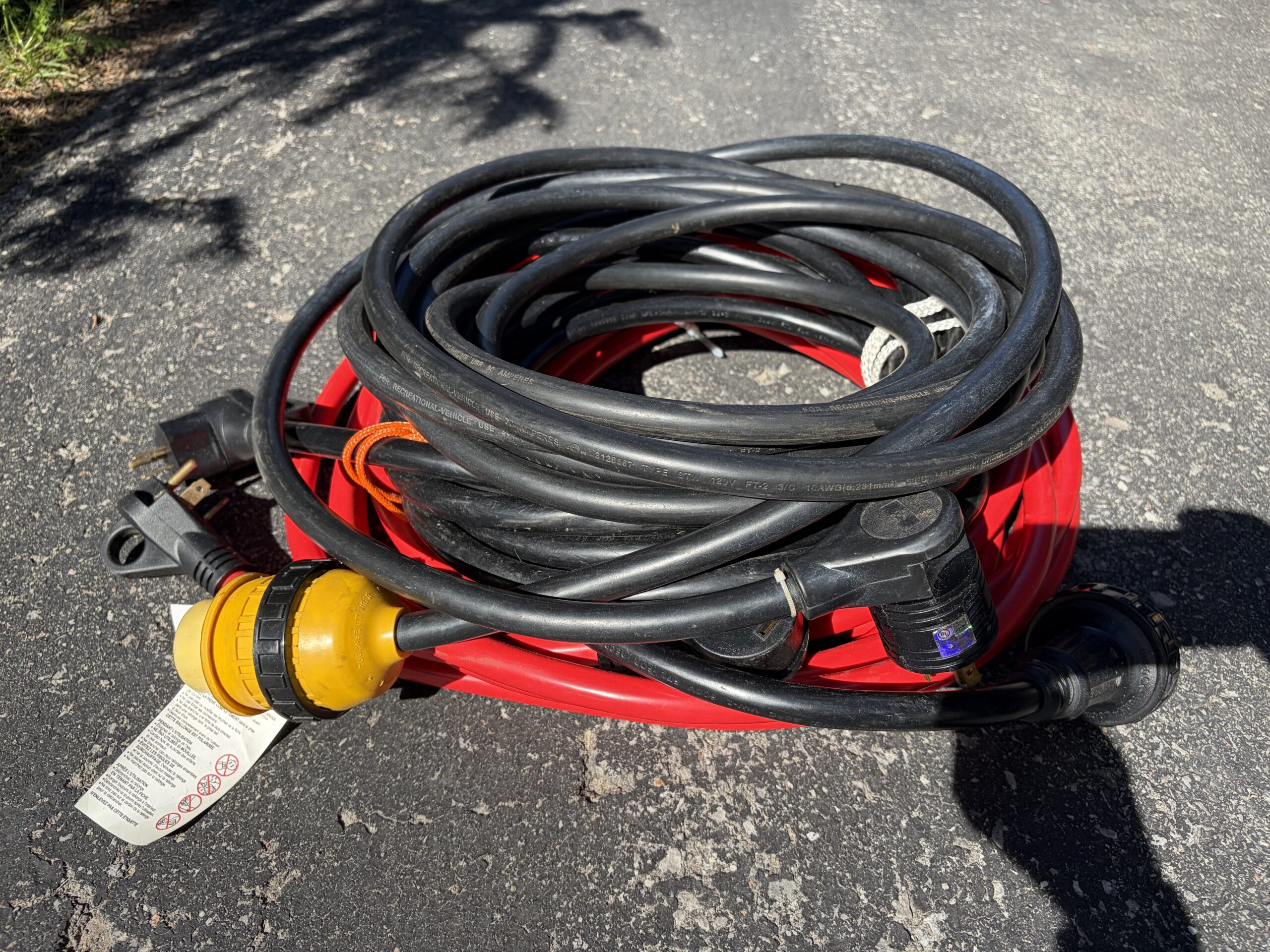 In our previous RV, we camped from Nova Scotia to BC and found that a 30-foot shore power cord was long enough almost everywhere except in Ontario provincial parks. For some reason, in our Ontario parks, the power pedestals can be located a long was from the camping sites. Three 30-amp shore power cables are included with the trailer so you won’t get stuck without shore power.Most provincial parks and private campground provide shore power which takes a 30-amp plug, but not all of them do. Several different power adapters are included so you can plug in to most of the other common types of plugs.A shore power surge protector is included with the trailer. The trailer has a lot of expensive electronics which could be wrecked by problems with shore power, so when we were plugged in, we always used a surge protector so that lightning strikes near our campground would not damage our electronics.
