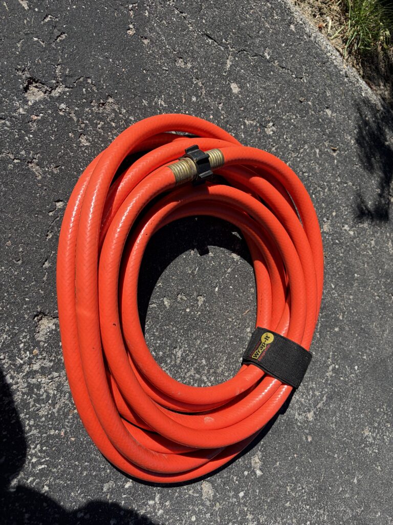 The plastic drinking water tanks on almost all boats and RV’s impart a slight chemical taste to the water which my wife finds particularly off-putting. I therefore installed a drinking water system on the trailer which is completely separate from the fresh water tanking in the trailer. The system uses 5-gallon refillable purified water tanks like you can buy throughout Ontario together with a separate water pump and tap.When staying in a campsite (as opposed to boondocking), there are occasions when the nearest water faucet is quite far away making it hard to fill the fresh water tank if you run out. The trailer includes 100 ft of collapsible water hose.