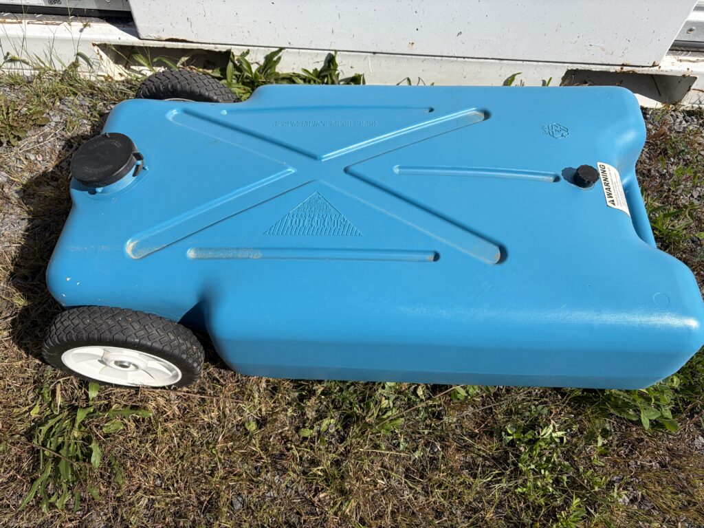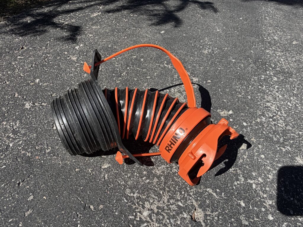 Getting rid of sewage means using a flexible plastic hose to connect the outlet valve on the trailer to a hole in the ground which leads to the waste storage tank at the dump station. When the dump valve at the trailer is opened, 25 gallons of sewage rushes out very quickly so it’s not the place for a flimsy hose. Rhino-branded hoses are probably the best in the business.When dumping sewage into a small hole in the ground, the last thing you want is for the hose to get loose and thrash around spewing waste everywhere. This Rhino attachment connects to the end of the sewage hose and the other end has an adapter to firmly connect to different dump hole sizes.When pumping out, it’s important to rinse the waste tanks and waste water hose but it’s vital that you don’t use your drink water hose when dealing with septic waste. The “safety orange” colour of this waste clean-up hose makes it hard to mix up with the drinking water hose.If you’re going to be boondocking for a while, you will need to do something with your black water (septic) water and grey (washing) water. The included Barker 22-gallon wheeled tank allows you to take your black and grey water to a pumpout station without moving the trailer. (A separately-purchased macerator pump is needed to move the waste water.)