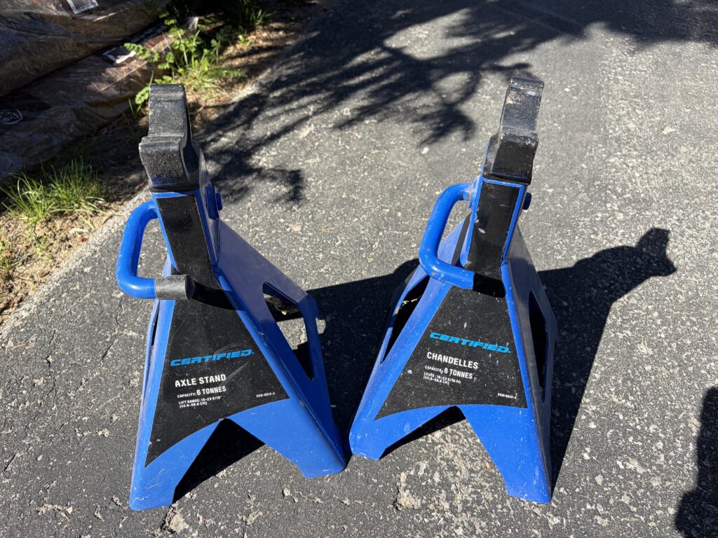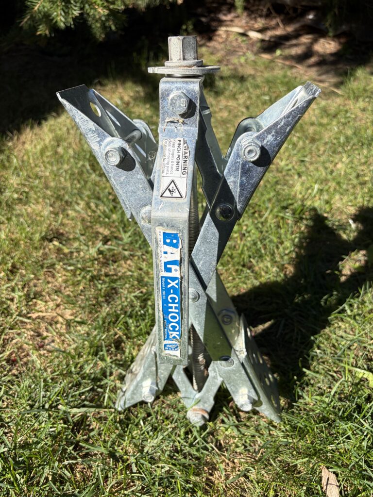 The trailer includes plastic chocks which are wedged behind the wheels to prevent the trailer from moving on the camp site when disconnected from the tow vehicle. In addition, there is also an X-chock (shown) which can be put between the wheels and screwed to expanding, adding more security.For the rare maintenance where the trailer (or the tow vehicle) needs to be jacked up, the 6-tonne jack stands included will be more than enough to safety support the trailer (which ways closer to 2 tonnes).